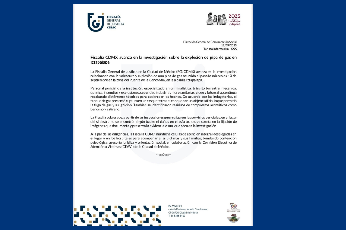 La Fiscalía General de Justicia de la Ciudad de México (FGJCDMX) informó que continúa con las investigaciones sobre la explosión de una pipa de gas LP ocurrida... Leer más.