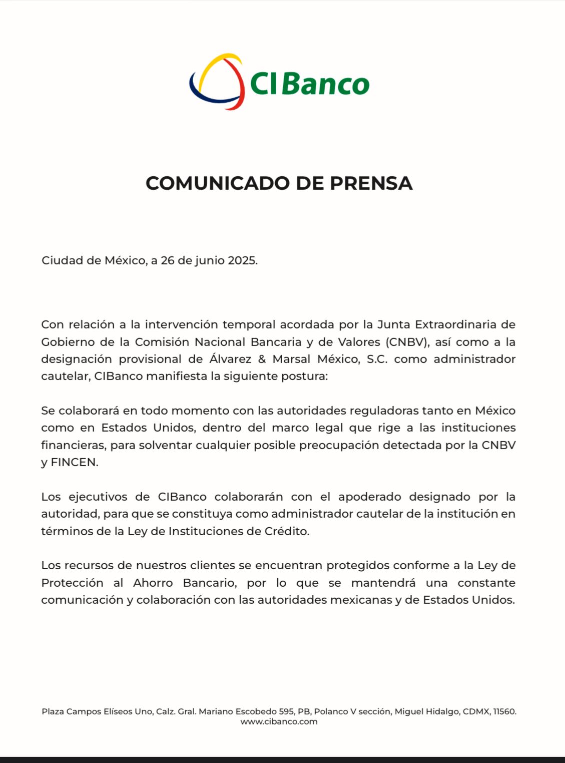 Ciudad de México, 26 de junio de 2025 — CIBanco emitió un comunicado en respuesta a la intervención temporal determinada por la Comisión Nacional Bancaria y de Valores (CNBV), que incluye la designación de Álvarez & Marsal México, S.C. como administrador cautelar.