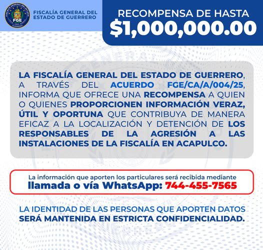 FGE Guerrero ofrece recompensa de un millón de pesos por información sobre ataque a su sede en Acapulco