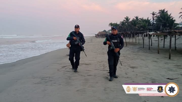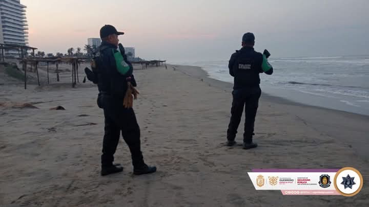 En el puerto de Acapulco, agentes de la Policía Ecológica de la Secretaría de Seguridad Pública realizan recorridos de seguridad en la franja de arena para proteger a los quelonios marinos en su temporada de anidación y prevenir delitos contra el medio ambiente.